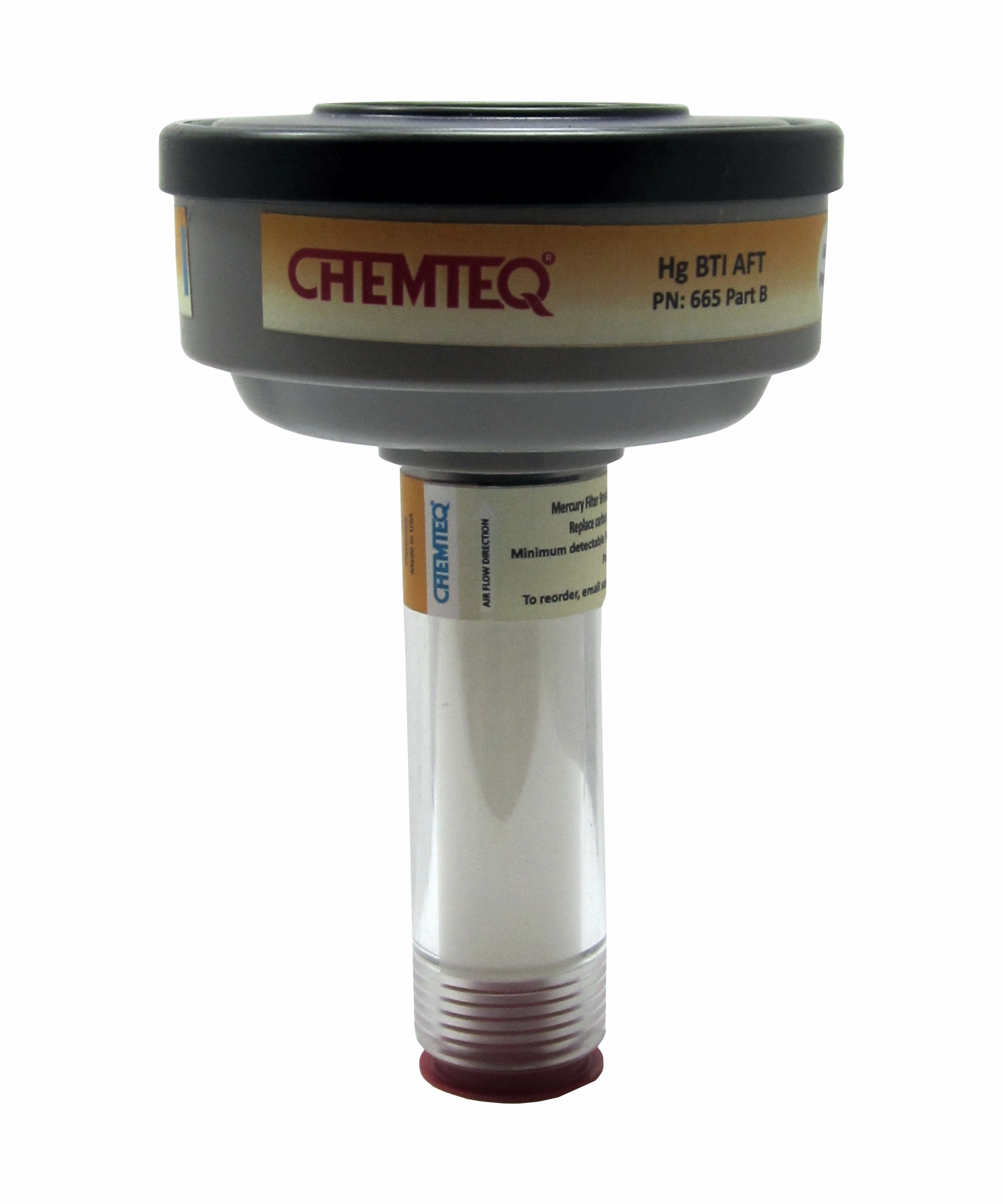 Mercury Breakthrough Indicator (BTI-AFT) is filter change indicator with auxiliary filter trap designed to provide real time indication of the breakthrough of mercury and mercury II compounds. Indicator is equipped with auxiliary filter trap to ensure no gases or vapors escape to the outside environment while the indicator changing color.